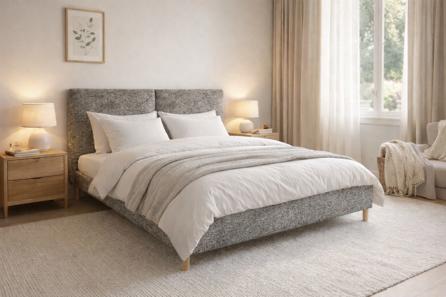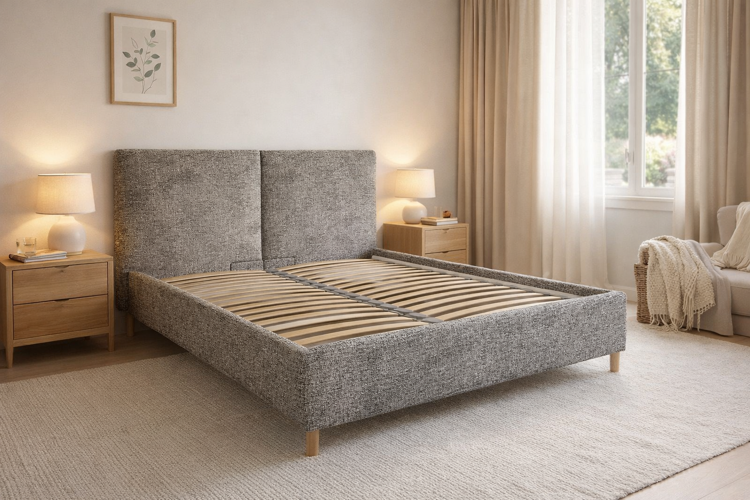 Voodiraamil on kangas eemaldatav. Nii saab voodit transportida lahtivõetult, kohapeal kokku paigaldada ning seejärel paigaldada raamile ühes tükis kangas peale. Nii ei jää külje- ja jalusipaneelide vahele nähtavat liitekohta vaid nurki kaunistab kena 45 kraadi all õmblus. Kate kinnitub raami alla takjapaelaga.
